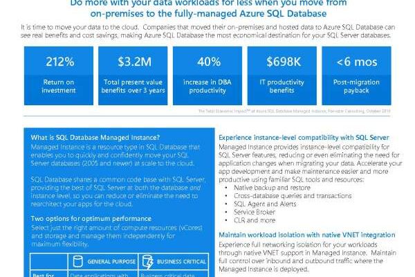 Azure SQL Database the most economical destination for your SQL Server databases. Companies experience a 212% return on investment and a 40% increase in DBA productivity. Read through this infographic for more on the benefits of moving your on-premises and hosted data to Azure SQL Database then reach out to Interactive America, Inc. to find out how we can help.