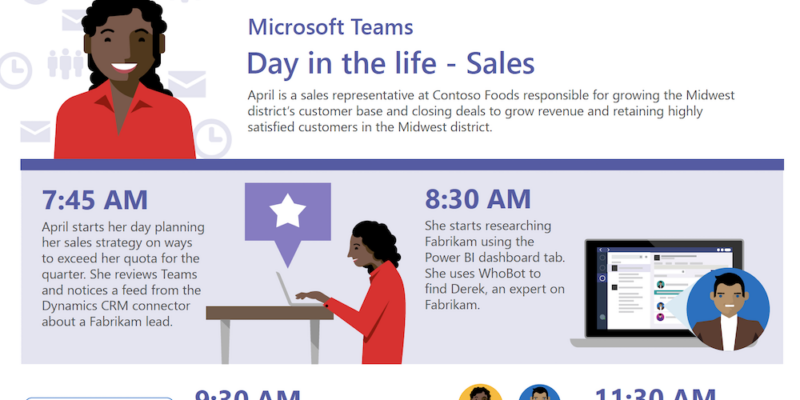April, a sales rep, is looking to grow her company’s Midwest customer base. She starts her day finding a lead in Microsoft Teams and then uses Dynamics and Power BI to dig out connections that turn that lead into an opportunity. By 5pm, she has a new resource to amp up more sales opportunities in the region.